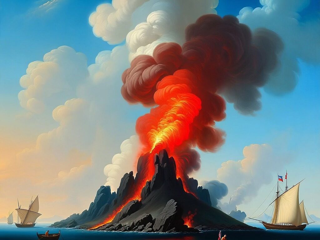 ഇവിടെ കാണുന്നത് 1831 ൽ ദ്വീപ് നേരിട്ട് കണ്ട ഫ്രഞ്ച് ജിയോളജിസ്റ്റ് കോൺസ്റ്റന്റ്റ് പ്രെവോസ്റ്റ് വരച്ച ചിത്രങ്ങളെ ബേസ് ചെയ്ത് AI കൊണ്ട് വരപ്പിച്ച ഇമേജ് ആണ്.