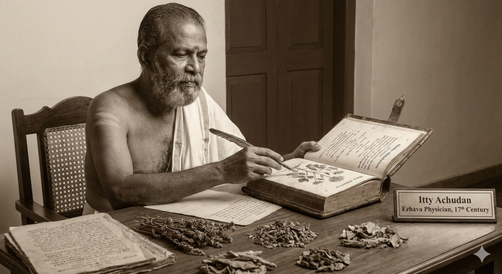 പതിനേഴാം നൂറ്റാണ്ടിലെ ഡച്ച് ഗ്രന്ഥമായ ഹോർത്തൂസ് മലബാറിക്കസിലൂടെ ലോകമറിഞ്ഞ, എഴവ വൈദ്യൻ ഇട്ടി അച്ചുതൻ്റെ അതുല്യമായ സംഭാവനകളും അദ്ദേഹത്തിൻ്റെ കൈയക്ഷരത്തിൻ്റെ പ്രാധാന്യവും ഈ താളുകളിൽ. കേരളത്തിൻ്റെ തനത് സസ്യസമ്പത്തിൻ്റെ അറിവുകൾ ലോകത്തിനു മുന്നിൽ എത്തിച്ചതിൽ അദ്ദേഹത്തിൻ്റെ പങ്ക് നിസ്തുലമാണ്.