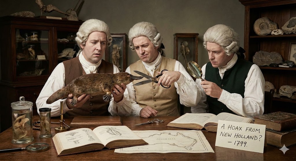 1799-ൽ ബ്രിട്ടീഷ് ശാസ്ത്രജ്ഞർക്ക് ഓസ്ട്രേലിയയിൽ നിന്ന് ഒരു വിചിത്രമായ ജീവിയുടെ മാതൃക ലഭിച്ചപ്പോൾ, അവർക്ക് അവരുടെ കണ്ണുകളെ വിശ്വസിക്കാൻ കഴിഞ്ഞില്ല. ഒരു താറാവിന്റെ കൊക്ക്, ഒരു കടൽനായയുടെ (beaver) വാല്, ഒരു നീർനായയുടെ (otter) ശരീരഘടന എന്നിവ ചേർന്നുള്ള ആ രൂപം ഒരു തമാശയായി മാത്രമേ അവർക്ക് കാണാൻ കഴിഞ്ഞുള്ളൂ. പ്രമുഖ പ്രകൃതിശാസ്ത്രജ്ഞനായ ജോർജ്ജ് ഷാ (George Shaw) ഈ മാതൃകയെക്കുറിച്ച് ആദ്യമായി ശാസ്ത്രീയമായി വിവരിക്കാൻ ശ്രമിച്ചപ്പോൾ, ഇത് ഒരു തട്ടിപ്പാണോ എന്ന് അദ്ദേഹം ഭയപ്പെട്ടു. ഒരു തമാശക്കാരനായ ടാക്സിഡെർമിസ്റ്റ് (taxidermist) വിവിധ മൃഗങ്ങളുടെ ഭാഗങ്ങൾ ഒരുമിച്ച് തുന്നിച്ചേർത്തതാണെന്ന് അദ്ദേഹം സംശയിച്ചു.